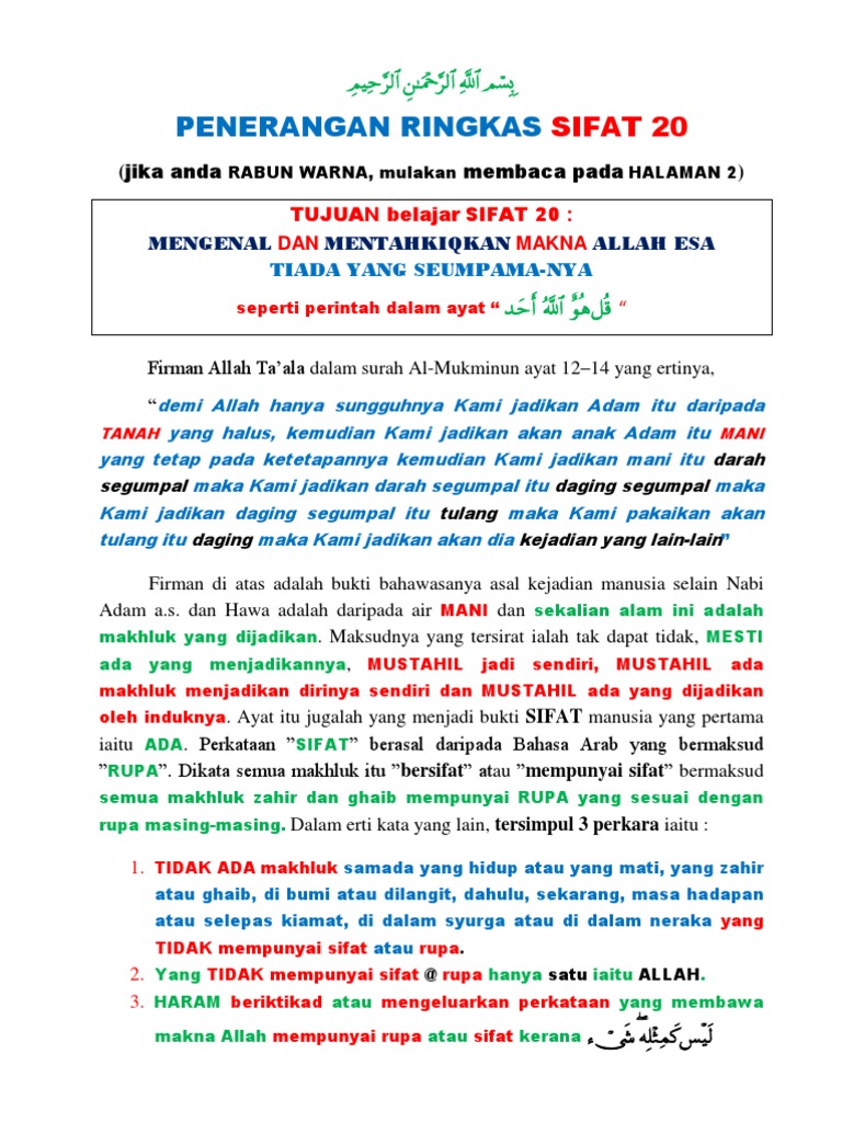 Sifat 20 Dan Maksudnya : See more of sifat 20 on facebook.. Sebagaimana kita ketahui, tauhid merupakan pilar utama dalam dalam ajaran agama islam. Posted by unknown at 08:46. Wajib bagi setiap mukallaf dan muslim mempercayai bahawa terdapat beberapa sifat kesempurnaan yang tidak terhingga bagi allah. Sifat salbiyah adalah sifat yang meniadakan adanya sifat sebaliknya. Ayat yang menjelaskan dalam al qur'an