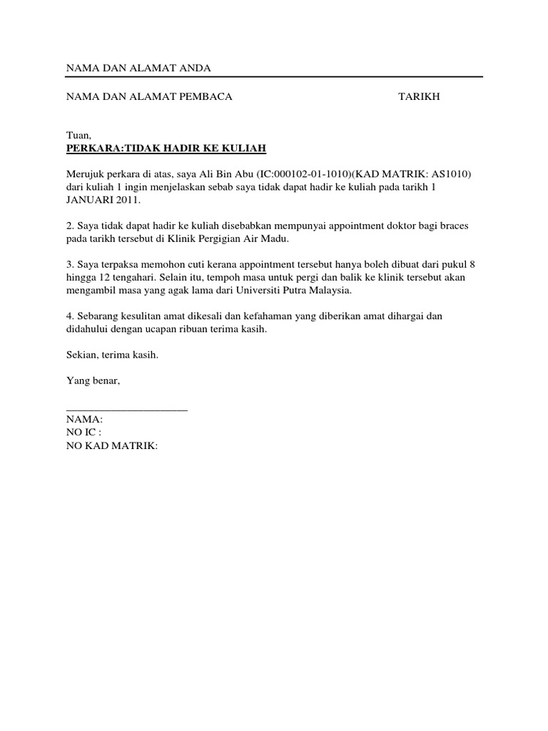 Contoh surat rasmi tidak hadir ke kuliah kerana masalah.