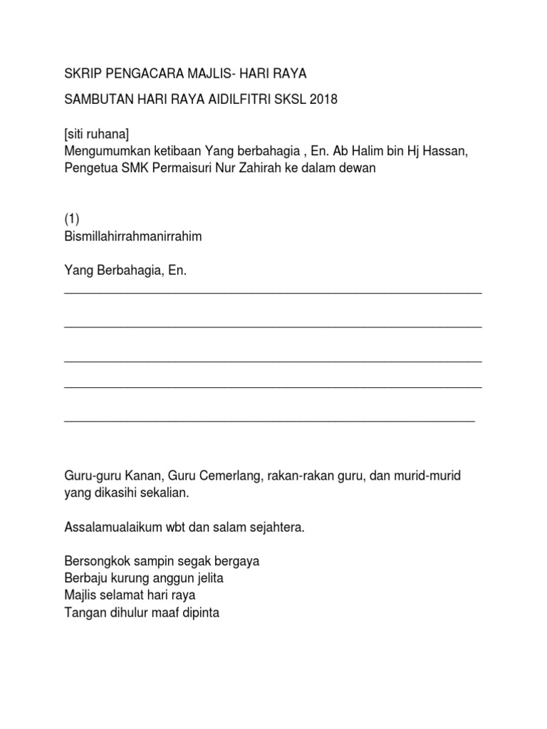 (perempuan) takbir bergema disubuh hari, tanda syawal menjelma kini jamuan aidilfitri sama dirai saling bermaafan. Majlis mempersilakan ustaz tuan haji iramdi bin ismail bagi memimpin pembacaan doa. Contoh teks terbaik dan lengkap dari mula program sehingga akhir penutup. Teks khutbah hari raya 2021 sebagai contoh & panduan buat kaum adam sekalian untuk dibacakan pada raya aidilfitri ini. Teks pengacara majlis sambutan aidilfitri (19/7/2017) smk raja abdullah time.